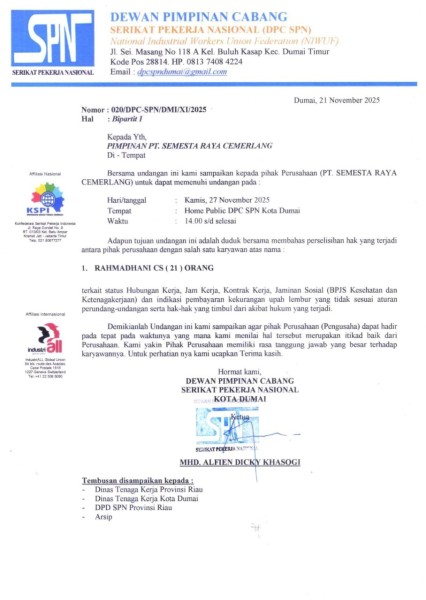 Dalam undangan bipartit yang dijadwalkan pada Kamis, 27 November 2025 di Home Public DPC SPN Kota Dumai, pihak perusahaan PT Semesta Raya Cemerlang tidak hadir tanpa memberikan keterangan apa pun.