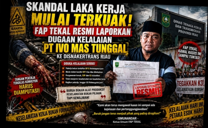 DUMAI (Thekingbingal) – Babak baru kasus kecelakaan kerja serius yang menimpa PA (inisial), pekerja PT ISS yang mengalami tangan tergilas mesin konveyor di area KCP PT. Ivo Mas Tunggal pada 05 Maret 2026 lalu, akhirnya memasuki fase penting. Ketua Umum Forum Aksi Peduli Tenaga Kerja Lokal (FAP-Tekal), Ismunandar, resmi melaporkan dugaan kelalaian PT. Ivo Mas Tunggal ke Disnakertrans Provinsi Riau.