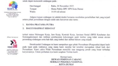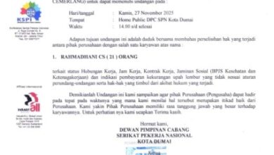 DUMAI (Thekingbingal) – Dewan Pimpinan Cabang Serikat Pekerja Nasional (SPN) Kota Dumai kembali menyoroti persoalan hubungan industrial yang melibatkan ex…